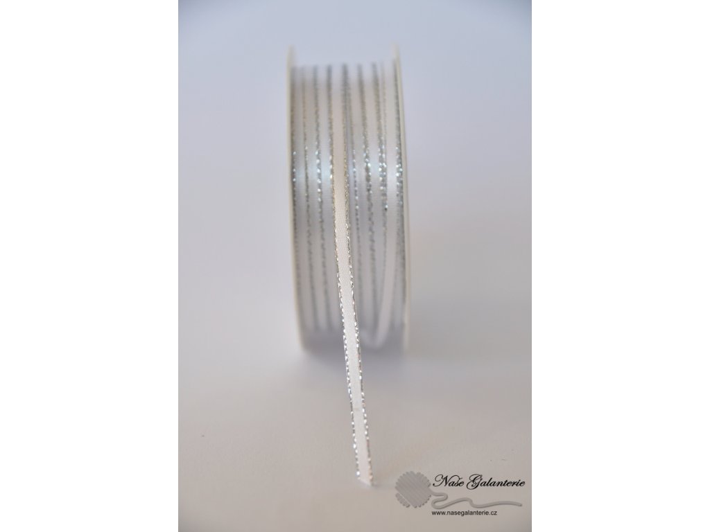 Vysoce kvalitní a elegantní jemně tkaná atlasová stuha oboulící /lesklé po obou stranách/, s rexorovým vláknem dodávající kovový vzhled. Stuha je poddajná a měkká s obšitými kraji - netřepí se. Cena je uvedena za 20 metrů. Český výrobek. Atlasová stuha se stříbrným okrajem.