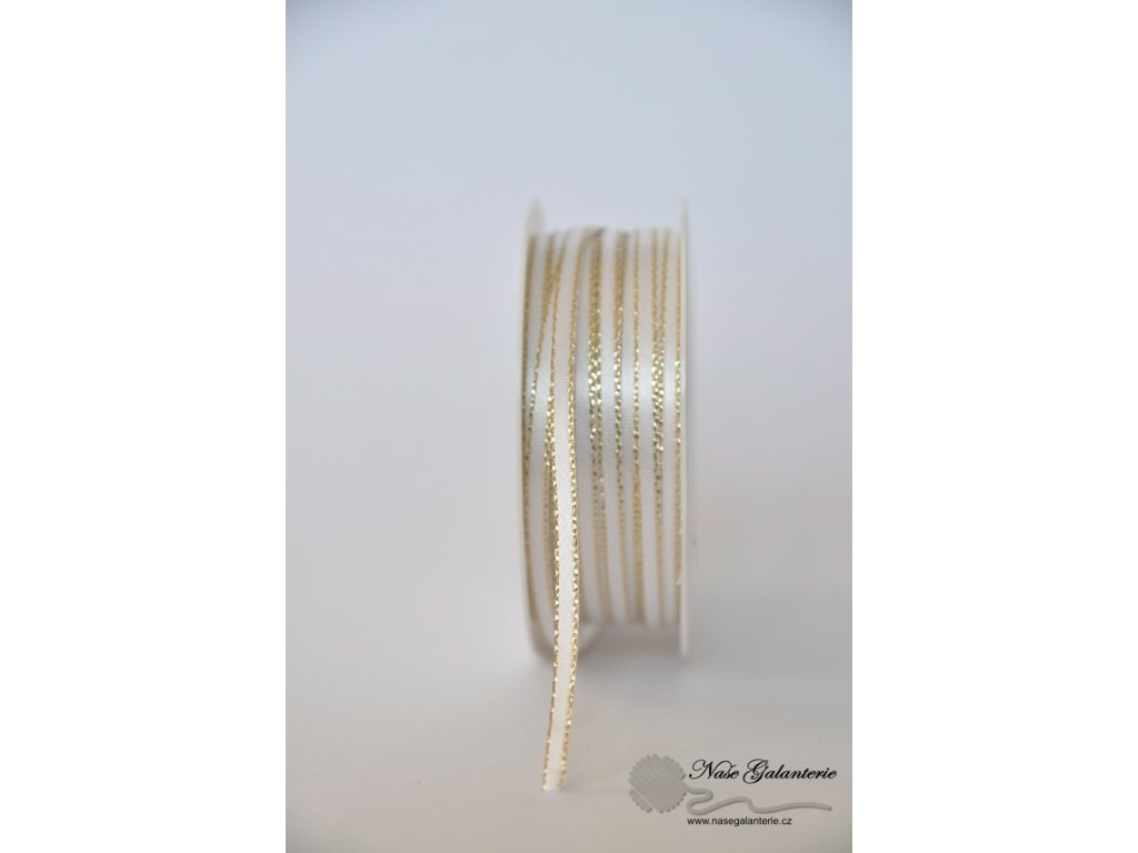 Vysoce kvalitní a elegantní jemně tkaná atlasová stuha oboulící /lesklé po obou stranách/, s rexorovým vláknem dodávající kovový vzhled. Stuha je poddajná a měkká s obšitými kraji - netřepí se. Cena je uvedena za 20 metrů. Český výrobek. Atlasová stuha se zlatým okrajem.