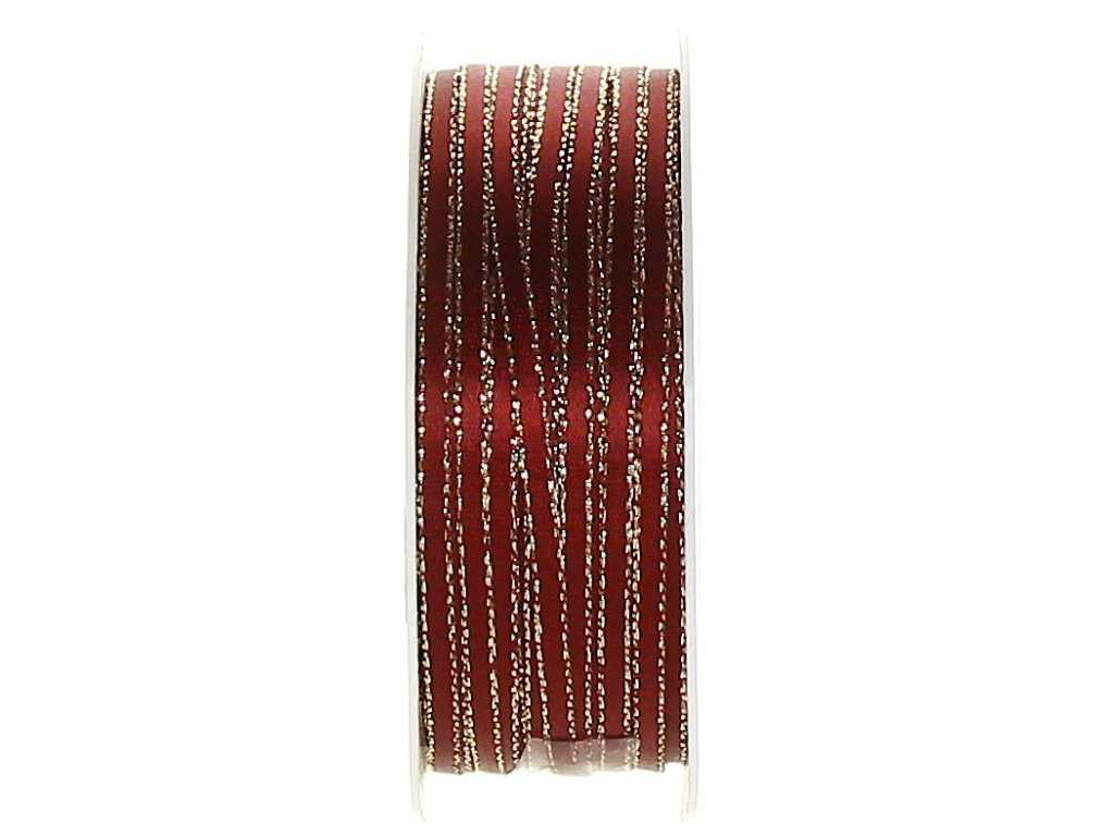 Vysoce kvalitní a elegantní jemně tkaná atlasová stuha oboulící /lesklé po obou stranách/, s rexorovým vláknem dodávající kovový vzhled. Stuha je poddajná a měkká s obšitými kraji - netřepí se. Cena je uvedena za 20 metrů. Český výrobek. Atlasová stuha bordó se zlatým okrajem.