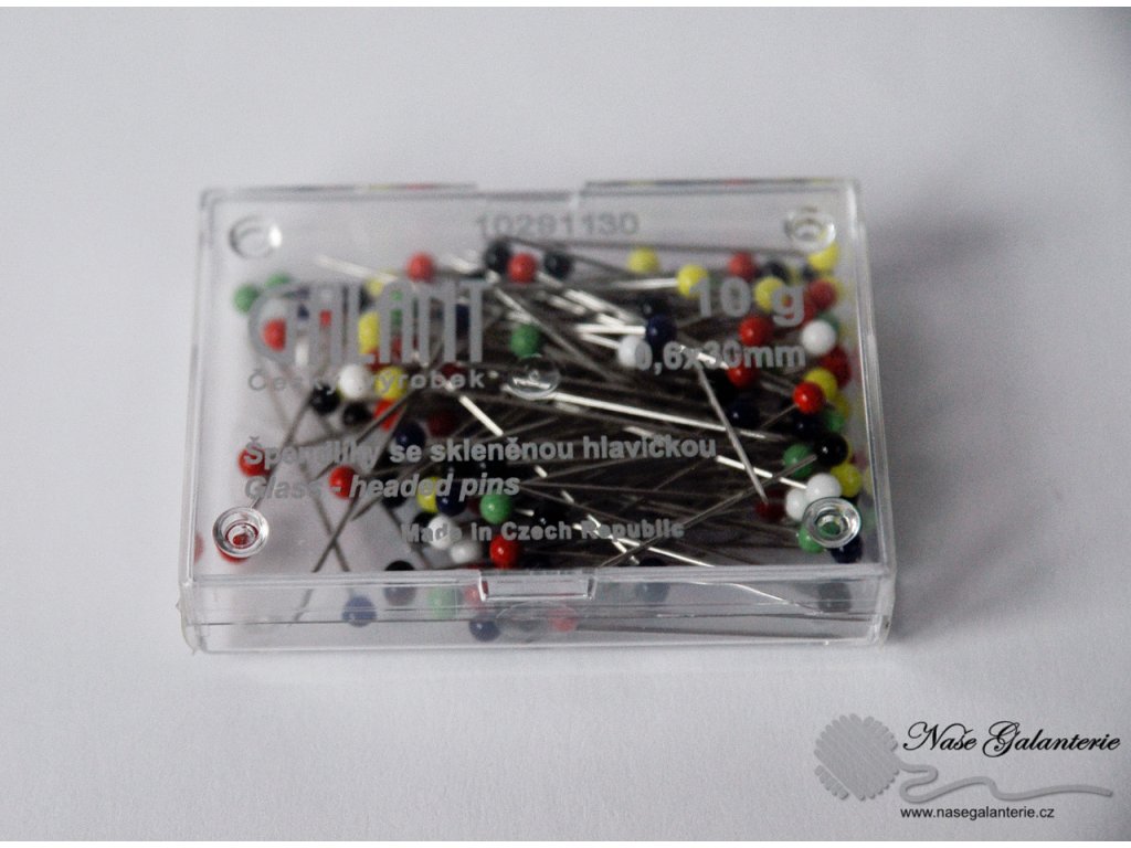 Špendlíky se skleněnou hlavou 30x0,6 mm, 10g / cca 100 ks / v plastové krabičce. Český výrobek.