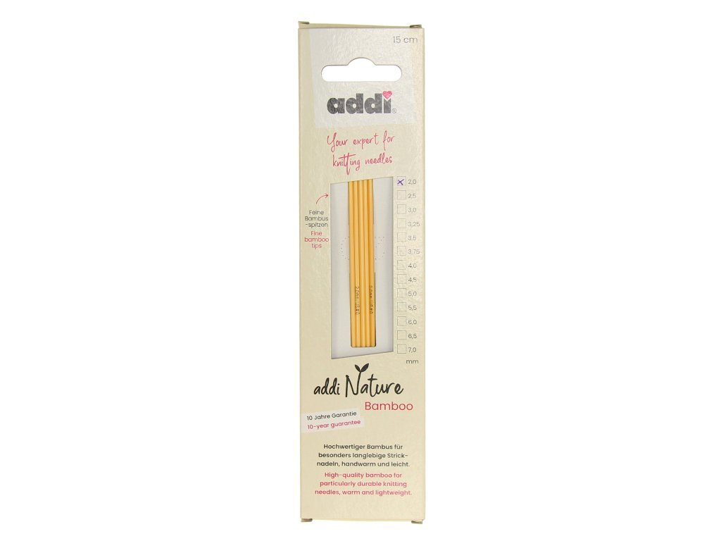 🧶 Ponožkové jehlice addiNature Bamboo přinášejí jedinečný zážitek z pletení díky přírodnímu materiálu, který je lehký, pevný a příjemný na dotek. Bambusové jehlice jsou tiché při práci a nekloužou z rukou, což oceníte při jemných i detailních projektech.