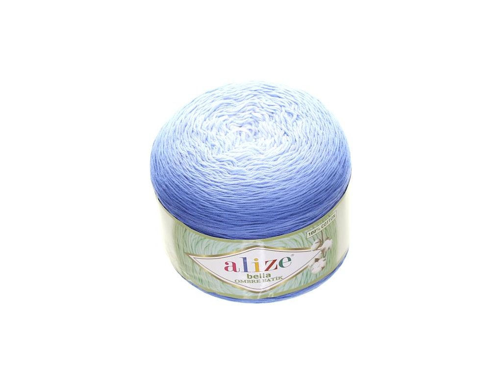 Duhové klubíčko Alize Bella Ombre Batik 7407, je jedna z nejvíce oblíbených bavlněných přízí pro její jemnost a pevnost s ombre efektem, přechod barev od nejsvětlejší po tmavší modrou je velmi pozvolný a mezi odstíny nejsou uzlíky.