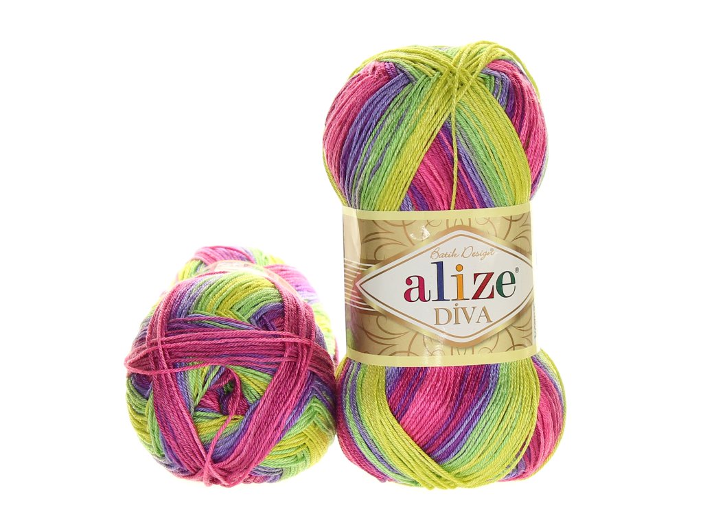 Alize Diva Batik je oblíbená, lesklá příze v nádherných melírovaných barvách, složená ze 100% akrylového mikrovlákna, vhodná pro pletení i háčkování letních úpletů, čepiček, triček, šatů, kloboučků a podobně s návinem 350 metrů. Váha 100g. Přibližná spotřeba na svetr velikosti 40 je cca 300 - 400 gramů.