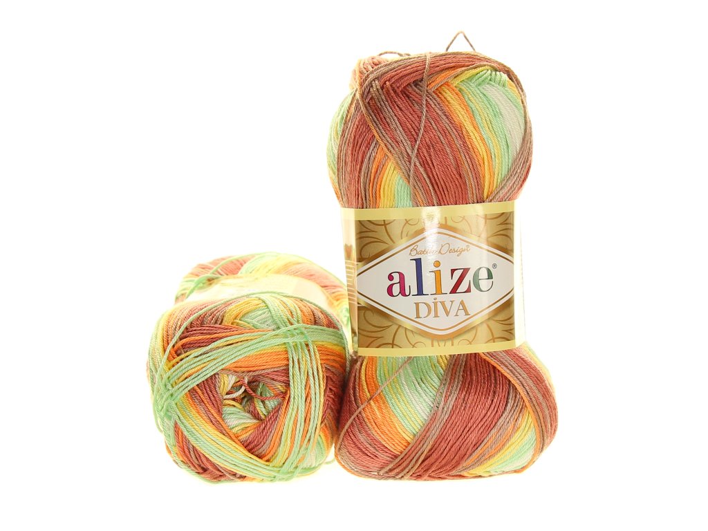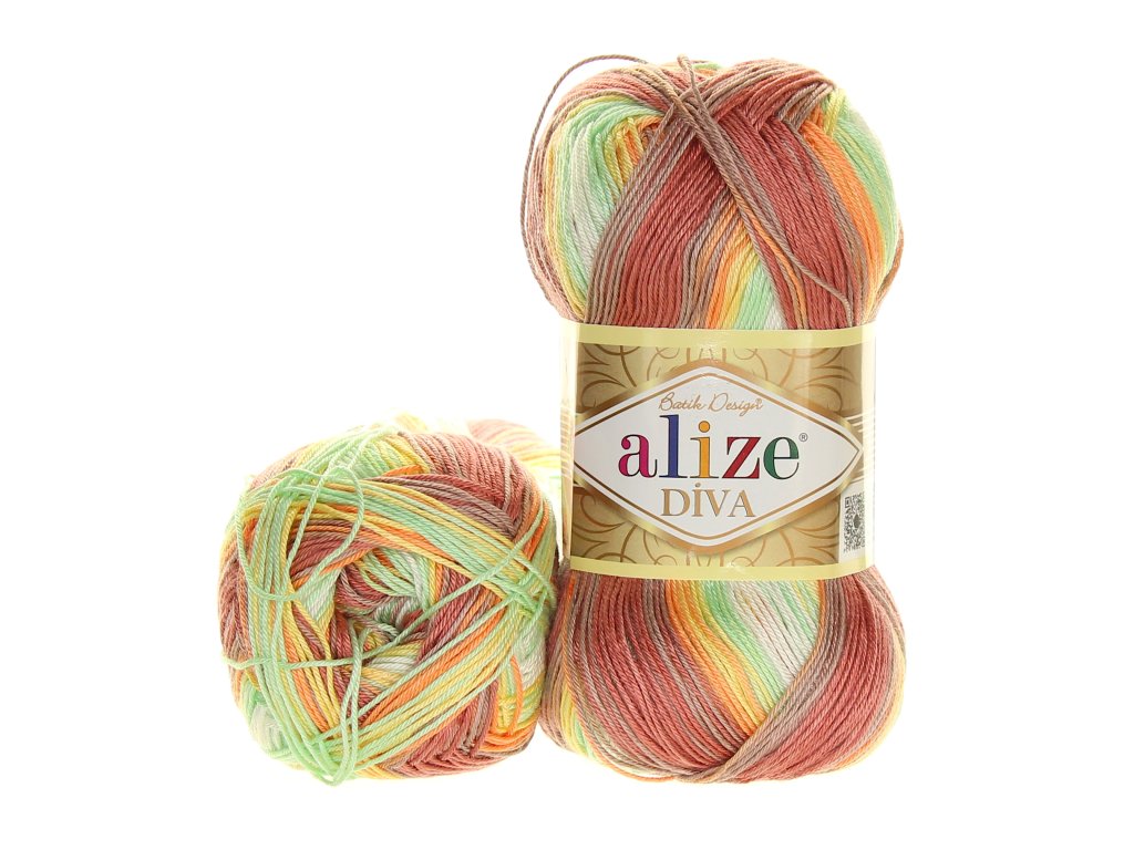 Alize Diva Batik je oblíbená, lesklá příze v nádherných melírovaných barvách, složená ze 100% akrylového mikrovlákna, vhodná pro pletení i háčkování letních úpletů, čepiček, triček, šatů, kloboučků a podobně s návinem 350 metrů. Váha 100g. Přibližná spotřeba na svetr velikosti 40 je cca 300 - 400 gramů.