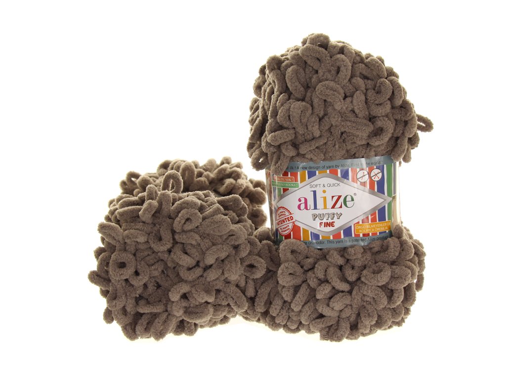 Alize Puffy Fine je lehká, chlupatá a jemná polyesterová příze, která má oka na proplétání. Jedná se o relativně nový způsob kdy na práci s přízí nepoužíváte jehlice, nebo háček, ale používáte prsty. Na přiloženém videu se můžete podívat na ukázku jak snadno se s přízí pracuje. Ve srovnání s Puffy je slabší, očka jsou menší.