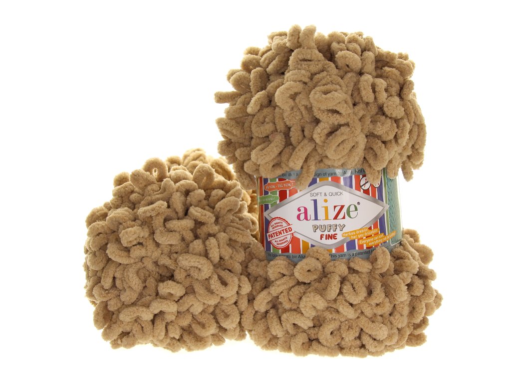 Alize Puffy Fine je lehká, chlupatá a jemná polyesterová příze, která má oka na proplétání. Jedná se o relativně nový způsob kdy na práci s přízí nepoužíváte jehlice, nebo háček, ale používáte prsty. Na přiloženém videu se můžete podívat na ukázku jak snadno se s přízí pracuje. Ve srovnání s Puffy je slabší, očka jsou menší.