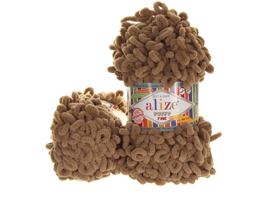Alize Puffy Fine je lehká, chlupatá a jemná polyesterová příze, která má oka na proplétání. Jedná se o relativně nový způsob kdy na práci s přízí nepoužíváte jehlice, nebo háček, ale používáte prsty. Na přiloženém videu se můžete podívat na ukázku jak snadno se s přízí pracuje. Ve srovnání s Puffy je slabší, očka jsou menší.