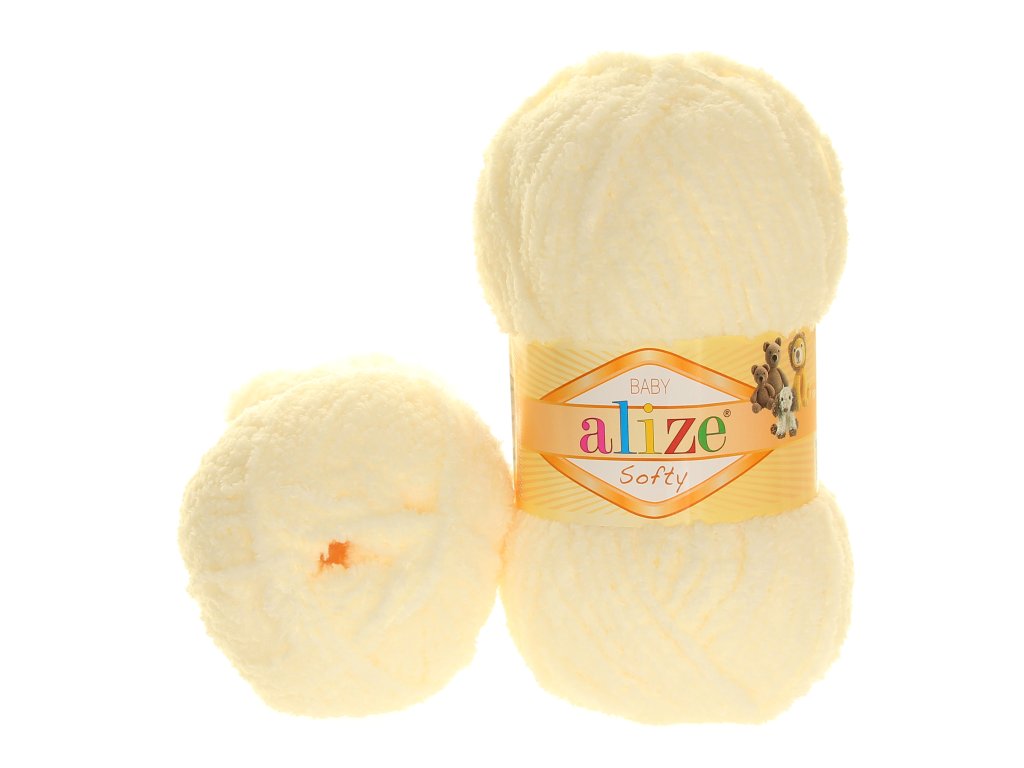 Hebká dětská příze Alize Softy s chlupem vhodná na dětské čepicky, svetříky, deky nebo pletené či háčkované hračky a podobně. Jemností je srovnatelná s přízi Doplhin baby, pouze slabší. Klubíčko je s návinem 115 metrů. Váha 50g.