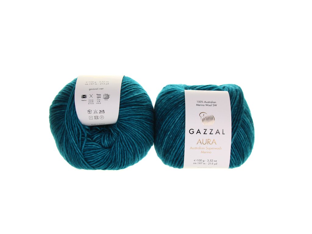 Gazzal Aura je příze ze 100% australského merina s úpravou Superwash, která spojuje přirozenou hebkost, teplo a nadýchanost s luxusním vzhledem ručního barvení. Je hebká na dotek, pružná a prodyšná – vhodná i pro citlivou pokožku.