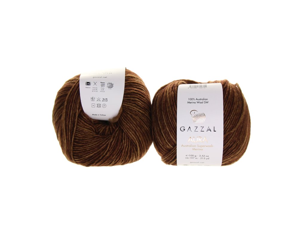 Gazzal Aura je příze ze 100% australského merina s úpravou Superwash, která spojuje přirozenou hebkost, teplo a nadýchanost s luxusním vzhledem ručního barvení. Je hebká na dotek, pružná a prodyšná – vhodná i pro citlivou pokožku.