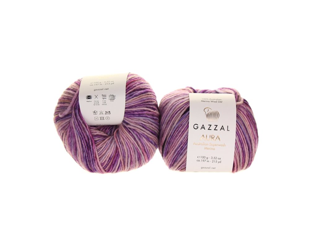 Gazzal Aura je příze ze 100% australského merina s úpravou Superwash, která spojuje přirozenou hebkost, teplo a nadýchanost s luxusním vzhledem ručního barvení. Je hebká na dotek, pružná a prodyšná – vhodná i pro citlivou pokožku.