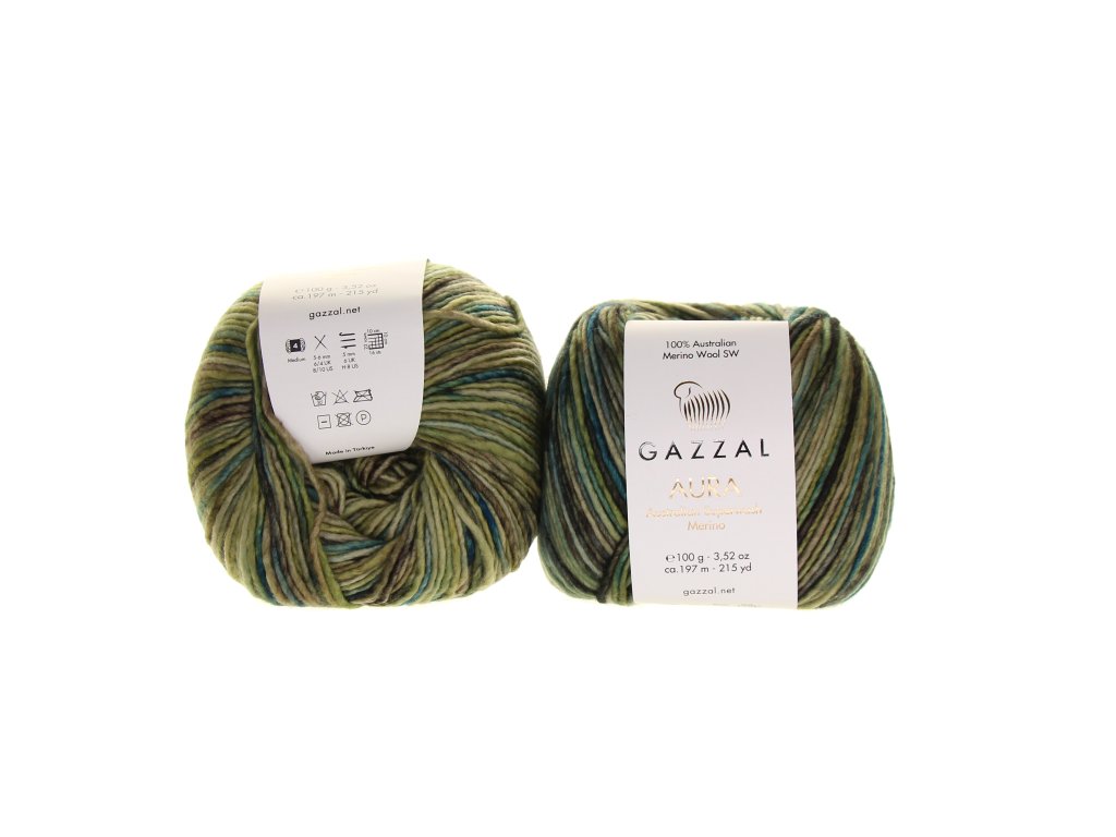 Gazzal Aura je příze ze 100% australského merina s úpravou Superwash, která spojuje přirozenou hebkost, teplo a nadýchanost s luxusním vzhledem ručního barvení. Je hebká na dotek, pružná a prodyšná – vhodná i pro citlivou pokožku.