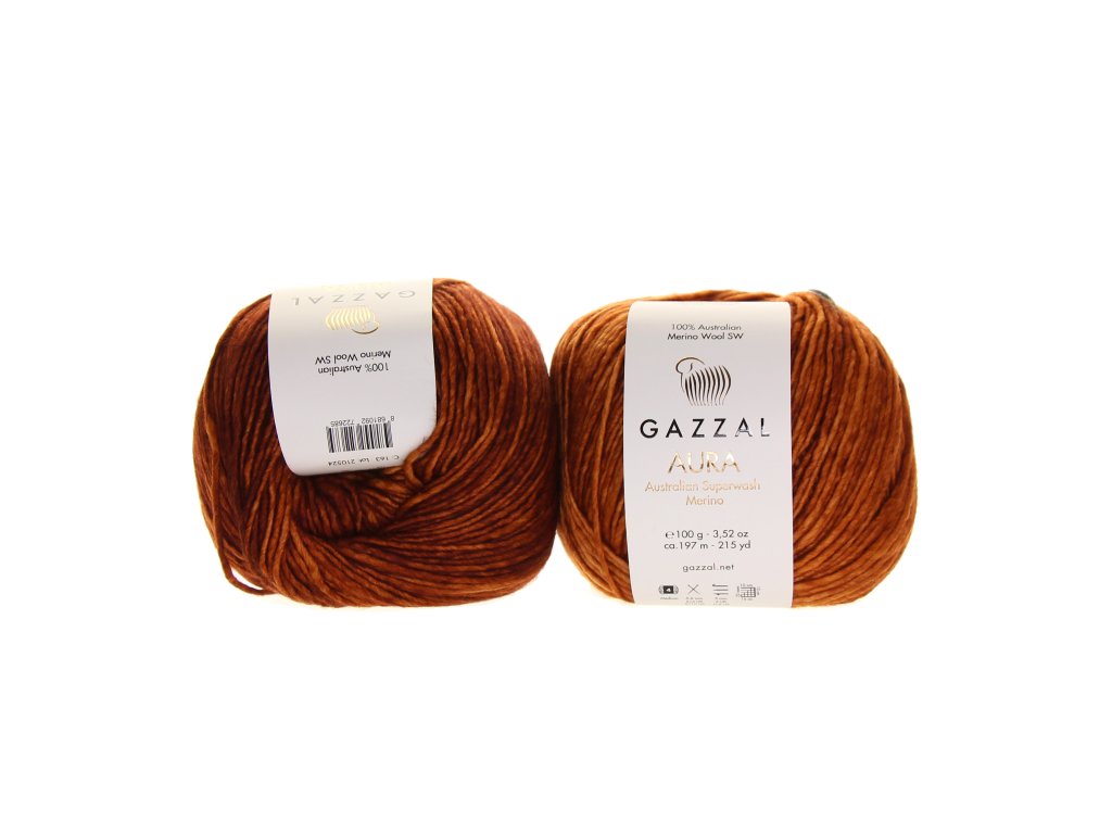Gazzal Aura je příze ze 100% australského merina s úpravou Superwash, která spojuje přirozenou hebkost, teplo a nadýchanost s luxusním vzhledem ručního barvení. Je hebká na dotek, pružná a prodyšná – vhodná i pro citlivou pokožku.