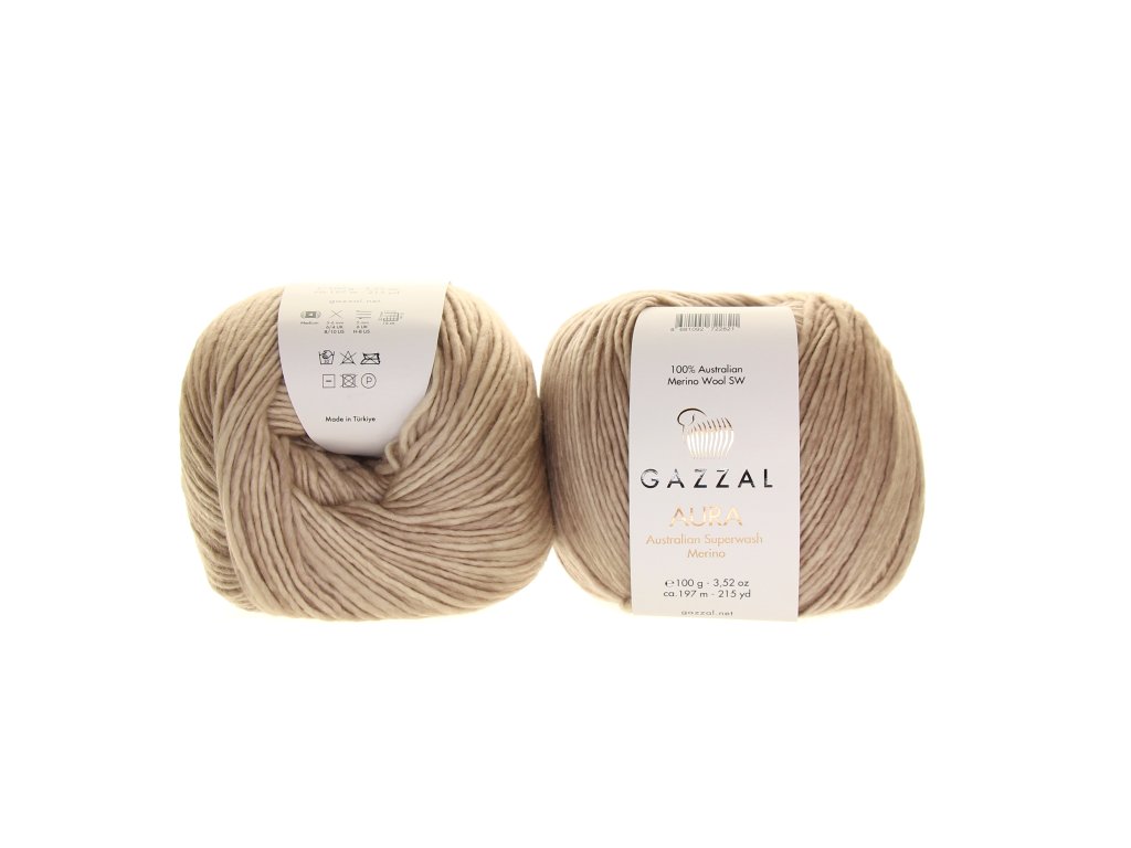 Gazzal Aura je příze ze 100% australského merina s úpravou Superwash, která spojuje přirozenou hebkost, teplo a nadýchanost s luxusním vzhledem ručního barvení. Je hebká na dotek, pružná a prodyšná – vhodná i pro citlivou pokožku.