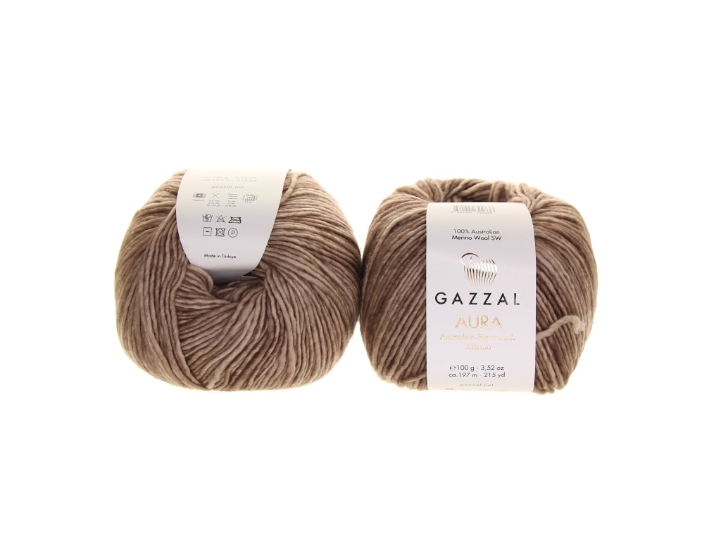 Gazzal Aura je příze ze 100% australského merina s úpravou Superwash, která spojuje přirozenou hebkost, teplo a nadýchanost s luxusním vzhledem ručního barvení. Je hebká na dotek, pružná a prodyšná – vhodná i pro citlivou pokožku.