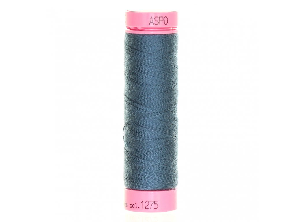 Amann Aspo nit modrošedá 1275, je univerzální polyesterová nit, která je velmi pevná, odolná vůči oděru, vhodná na šití všech druhů textilních materiálů z přírodních, směsových i syntetických vláken. Neztrácí svůj odstín na světle, ani po vyprání.
